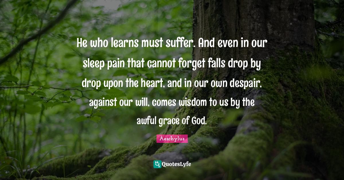 He who learns must suffer And even in our sleep Pain that cannot forget Falls drop by drop upon the heart And in our own despair Against our will Comes wisdom to us. Drop drop in our sleep upon the heart. He who learns must suffer and even in our sleep pain that cannot forget falls drop by drop upon the heart and in our own despair against our will comes wisdom to us by the awful grace of God.